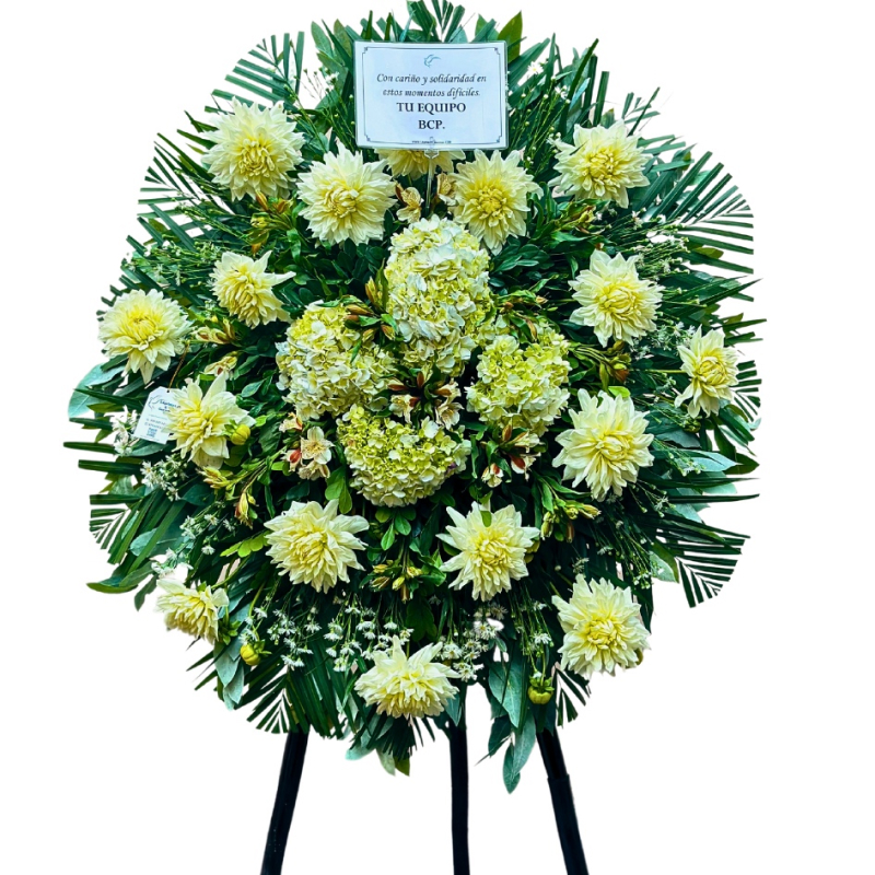 Corona fúnebre blanca, con dalias hortensia, monte casino, hojas de palmera y hojas de eucalipto