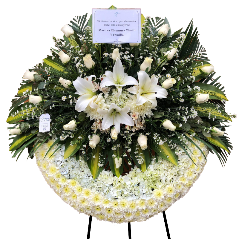 Corona fúnebre, con hortensias blancas, rosas blancas, gladiolos, pompos y monte casino