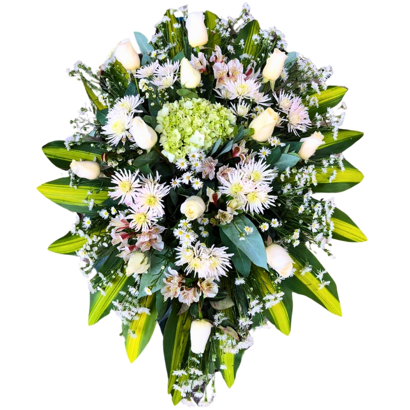 Lagrima funebre con rosas blancas, hortensia, hoja de palmera y finos follajes.