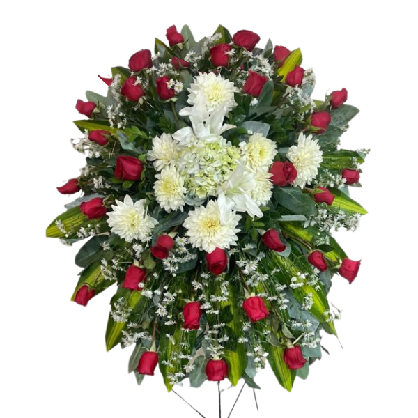 Elegante lagrima de hermosas rosas rojas, pompon blanco, hojas de palmera