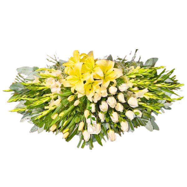 Elegante y distinguido manto funebre con hermosos tulipanes blancos, rosas blancas, lirios blancos, gladiolos, finos copos de nieve, helechos de cuero.